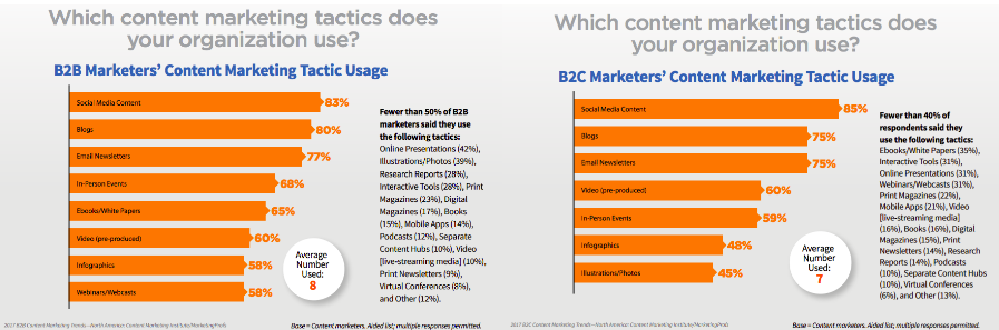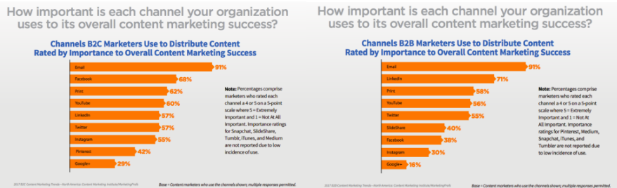 For B2C marketers, Facebook and email take the top spot when it comes to content distribution. 89 percent of marketers said they use the channels for their content, 26 percent above the closest channel, Twitter.