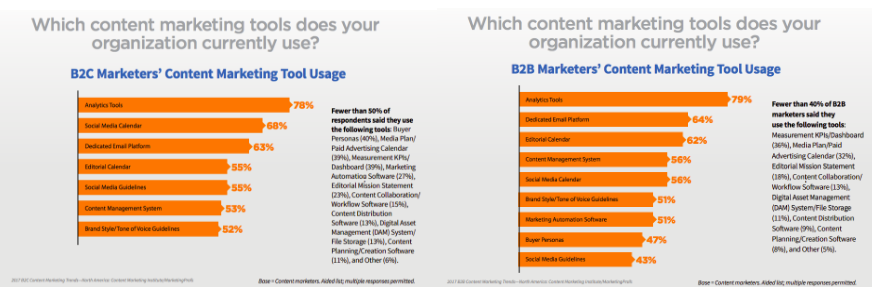 However, analytics aside, it’s somewhat amazing how many content marketers don’t use critical tools such as email platforms, calendars, and CMSs. Perhaps they’re sending out email manually, or using a physical calendar tacked to the wall? CMSs are required to publish content, so the fact that only about half of marketers are using them is difficult to square.