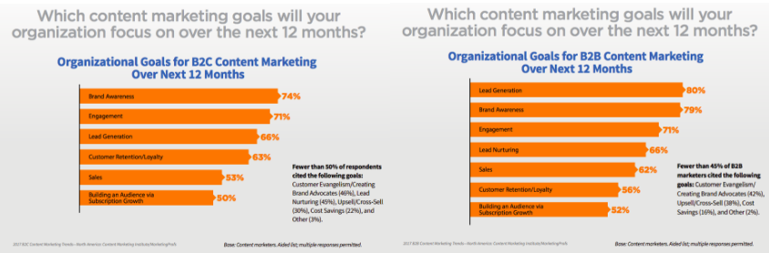 Even though some marketers are obsessed with finding one-to-one ROI, plenty of others still want brand awareness more than anything. Even B2B marketers, whose ultimate goal is always direct sales, named brand awareness a key content marketing goal.