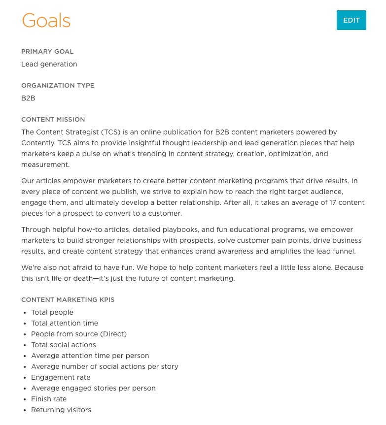 Defining clear, measurable goals is a cornerstone of a successful content strategy, providing focus, direction, and benchmarks for success. Yet, many marketers struggle to identify what successful content looks like. Contently provides prompts that help you define the primary goal, be it brand awareness or lead generation, which can help set the direction for the content strategy.