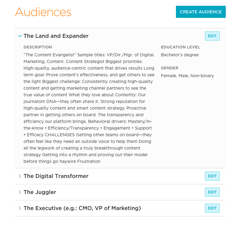 Contently allows you to incorporate this audience data into your content marketing strategy. It enables you to document and organize your audience personas, providing a constant reference point for all content creation efforts. This audience-centric approach helps ensure that every piece of content you create has a specific purpose and target, leading to more personalized and effective content.