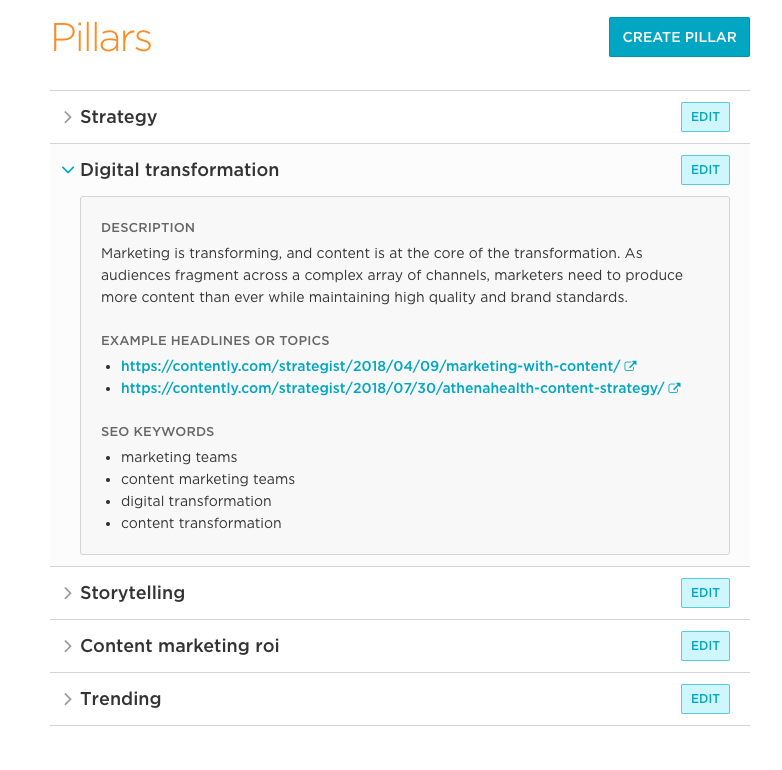 Contently enables users to create and manage pillar descriptions and links to published content related to the pillar. This provides four main benefits: