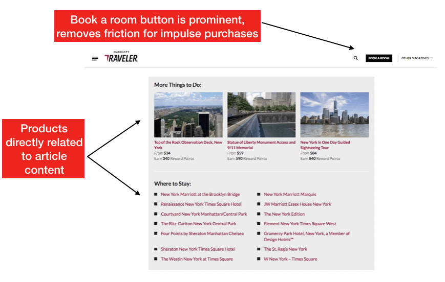 Even though Marriott Traveler doesn’t push product, it drives millions of dollars in direct revenue for the hotel giant. How? The site does a really good job of recommending related products and experiences to the story that you’re reading.