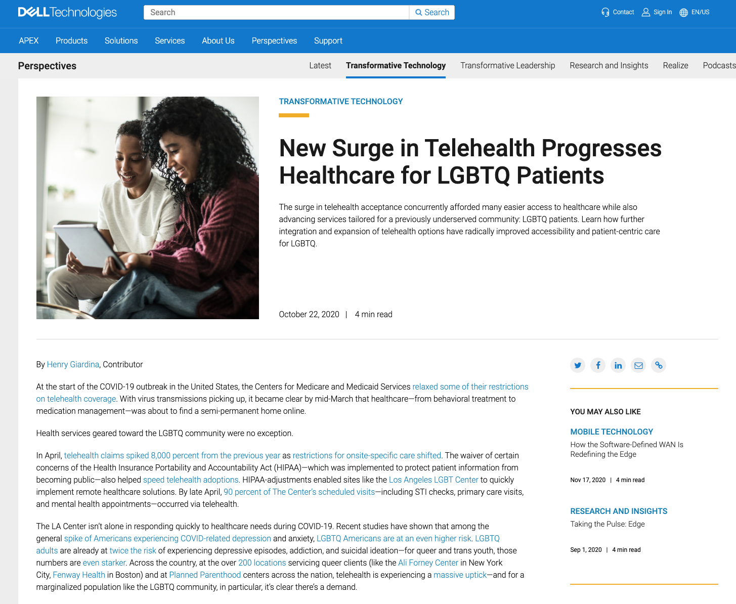 The series spanned everything from this fascinating story about a Dell Technologies employee making face shields at home to this fantastic feature on how a new wave of telehealth access was helping address the needs of the LGBTQ community.
