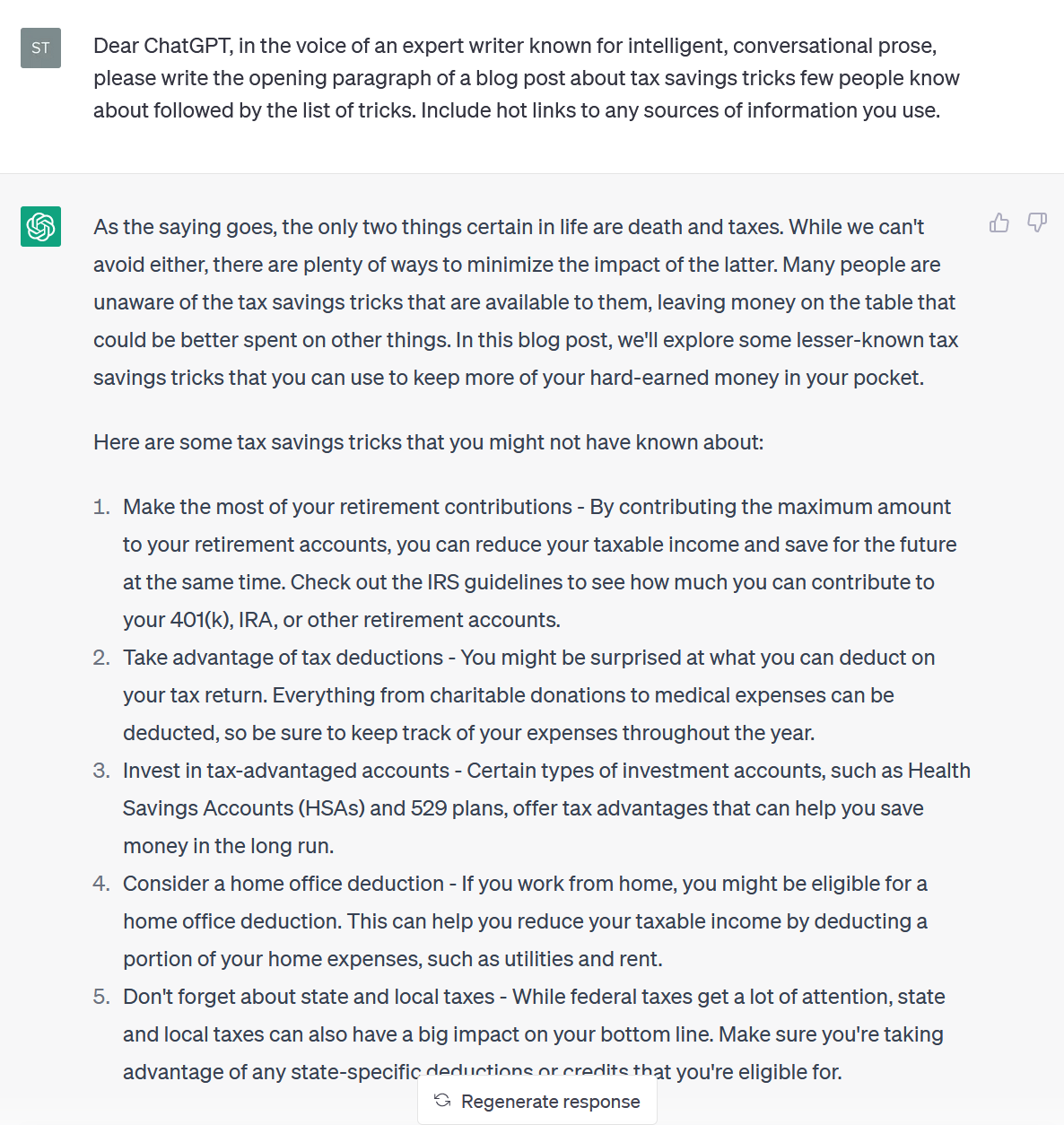 The resulting output included a chatty opening sentence referencing that old chestnut about death and taxes, followed by the reassurance that the reader could minimize the latter by taking advantage of retirement savings, deductions, tax-advantaged accounts, and special state write-offs.