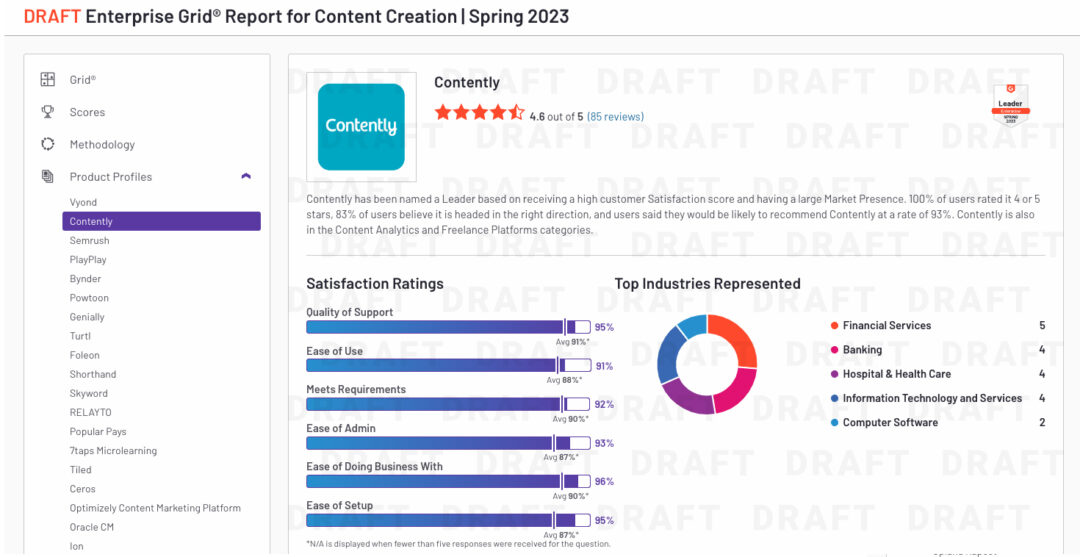 In G2’s Usability Index for Content Creation, users gave Contently high ratings when it comes to ease of use, ease of admin, and meeting software requirements.