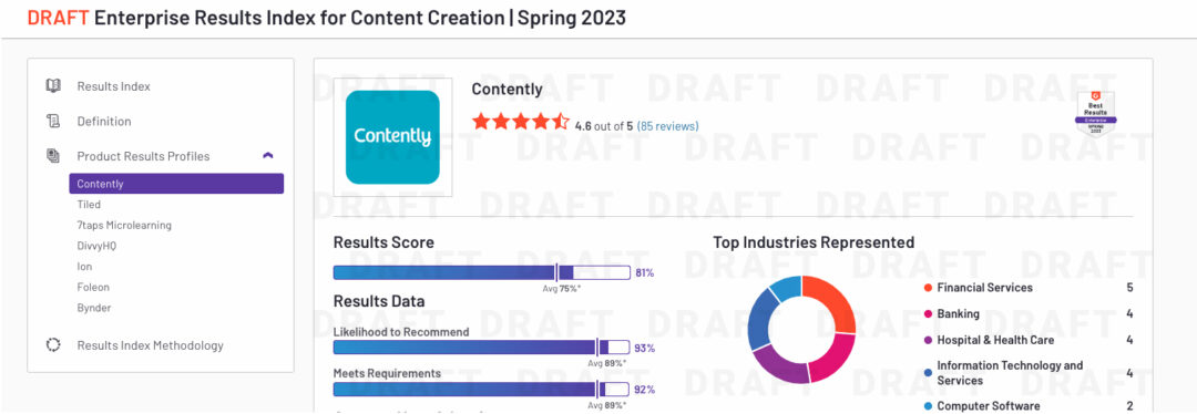 G2’s Enterprise Results Index for Content Creation ranks products based on factors in real-user satisfaction ratings for a number of results-related review questions. Contently’s enterprise customers capture an average of 6x ROI in just months.